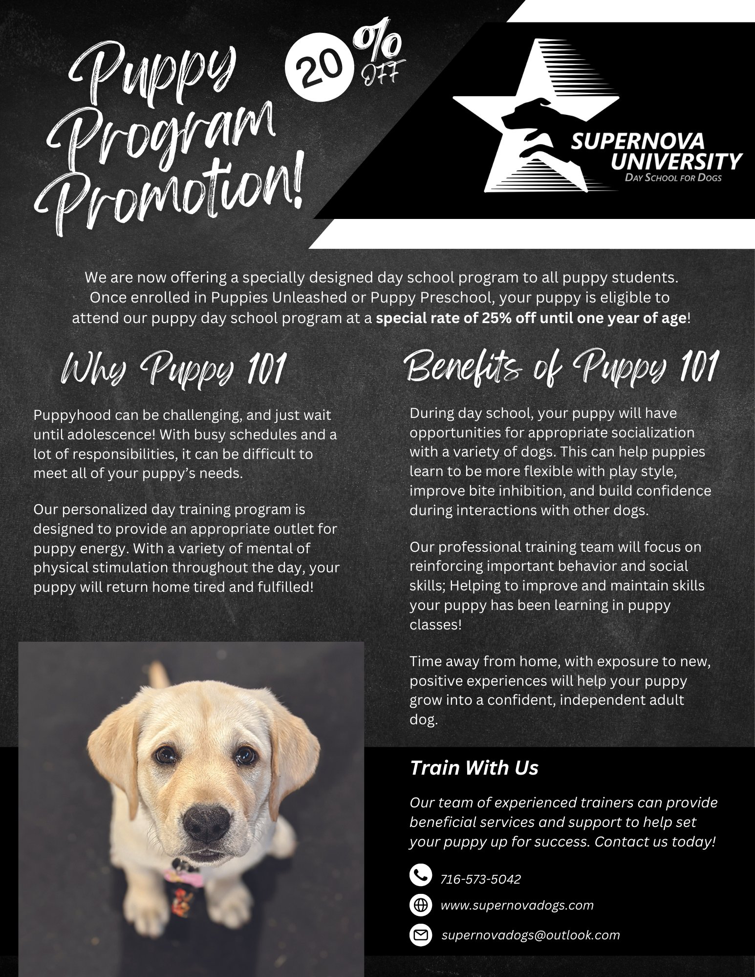 To participate, contact the office at supernovadogs@outlook.com or 716-573-5042 with your name, your puppy’s name, date of registration in puppy class, and your puppy’s date of birth. You will be issued a promotional code for registration (purchase of a package) which will expire on your dog’s first birthday. This code will be applicable for all of our day school packages. To register, visit our registration page to select your day school package, add to cart, and apply the coupon code before submitting payment. Once your package has been purchased, you will be able to schedule your school days.